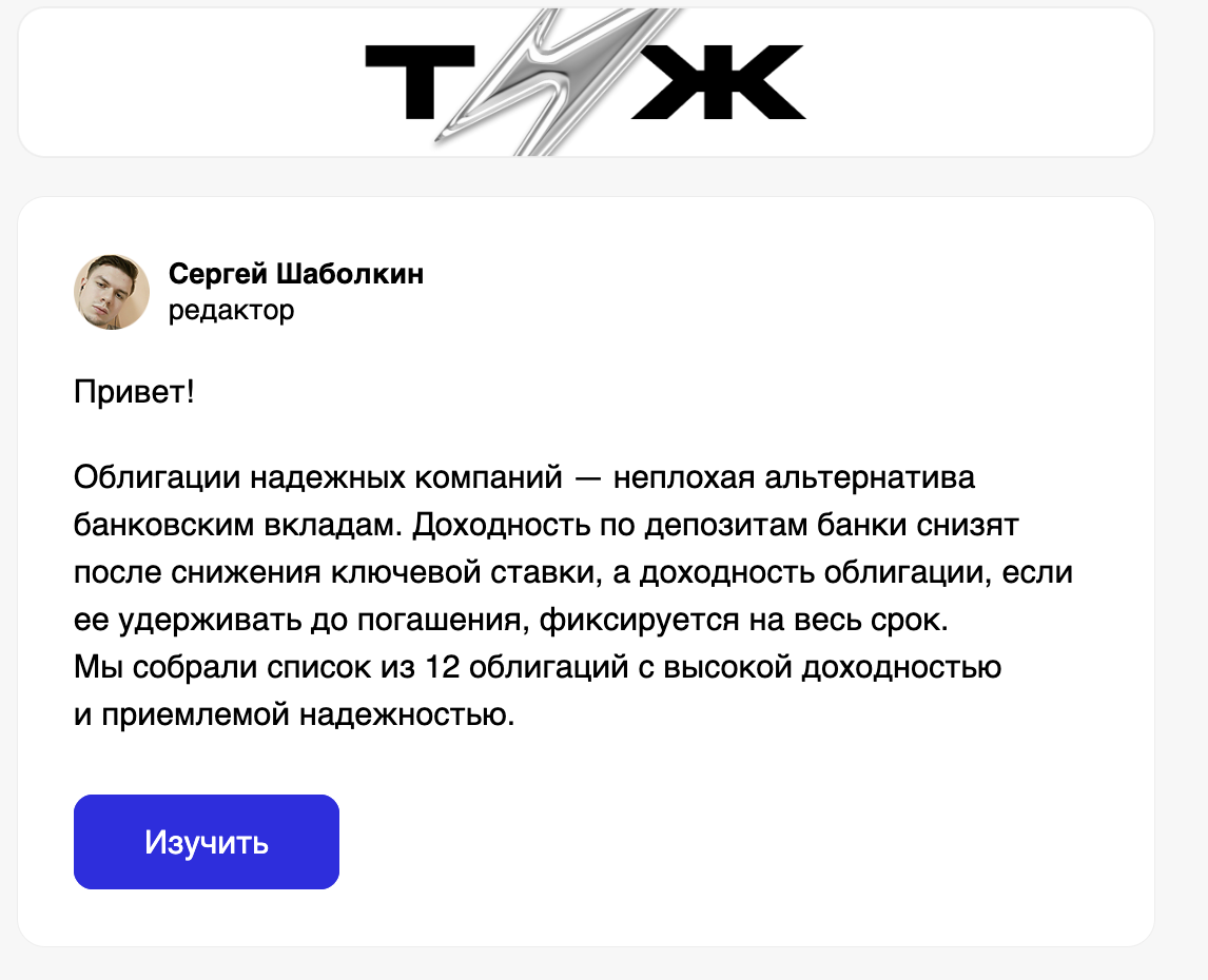 В эту категорию попадают дайджесты, новости, статьи, гайды или чеклисты — весь полезный контент, который отправляются подписчикам. Иногда такие письма интегрируют в триггерные цепочки для активации или удержания клиентов. Вот как выглядит шапка контентной рассылки ТЖ. Дальше в письме краткие выжимки свежих материалов со ссылками на полные версии.
