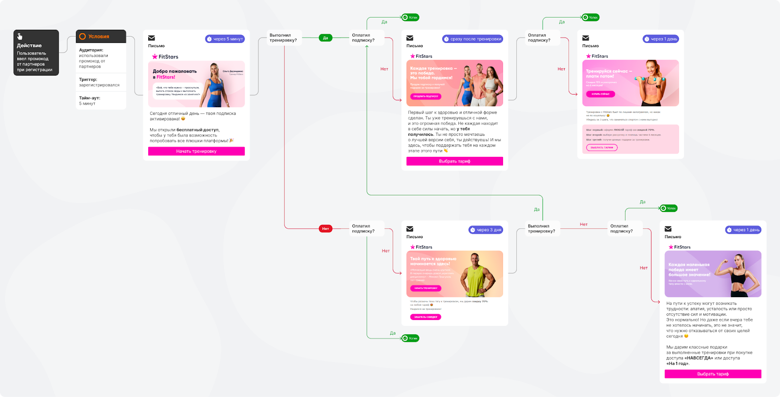Чтобы лучше понять свою аудиторию, команда FitStars собирает данные о посетителях сайта по более чем 20 параметрам. Они знают, откуда пользователь пришел, что ему интересно и какие тренировки он выполняет. Вся информация собирается в Сarrot quest, а потом используется для настройки рассылок. Например, для холодной аудитории из рекламных каналов работает одна цепочка, а для теплых пользователей от партнеров — другая.