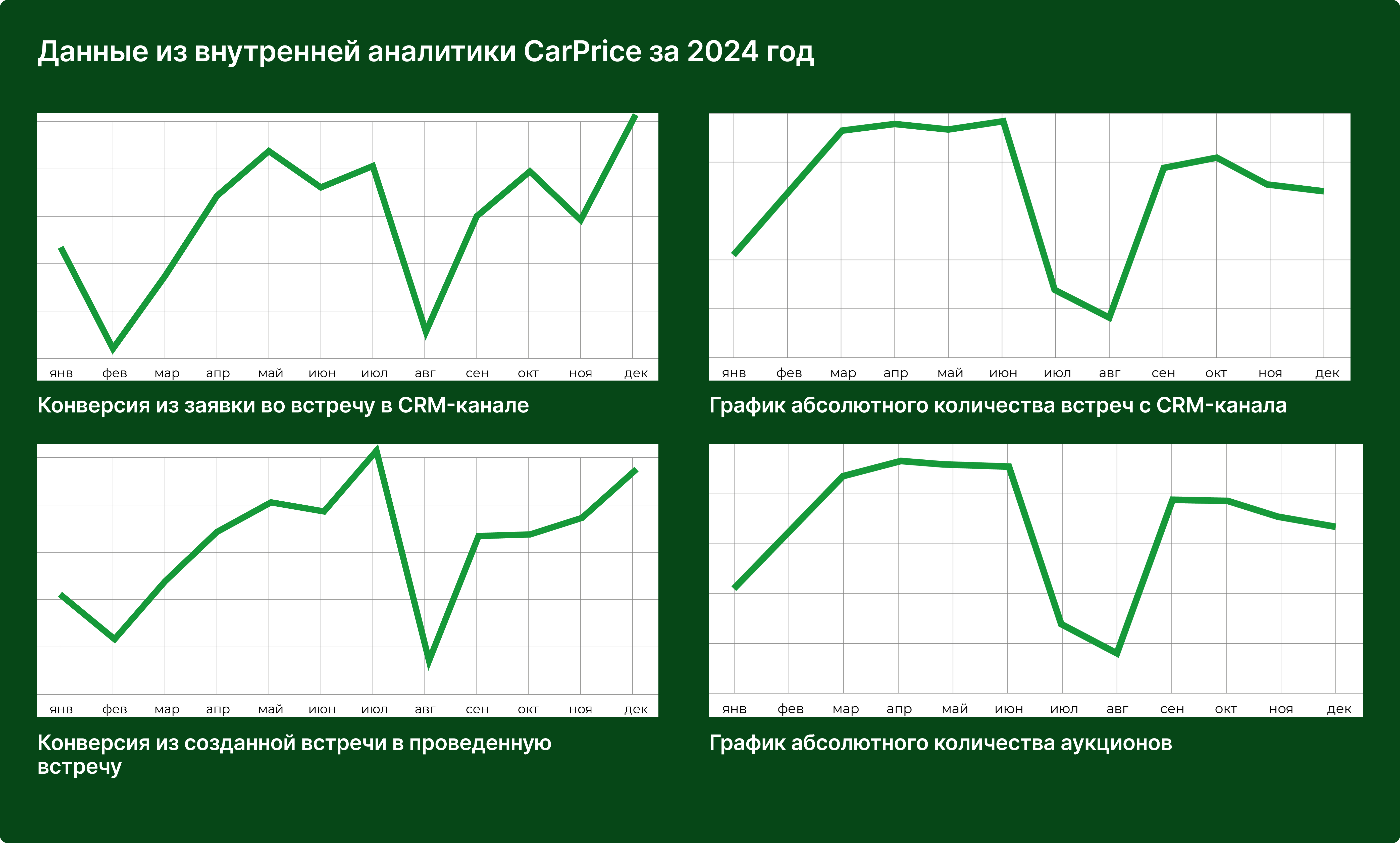 На всех графиках CRM-канала за 2024 год видна просадка в июле, когда сервис Exponea ушел из РФ. В августе начался переезд на Carrot quest: