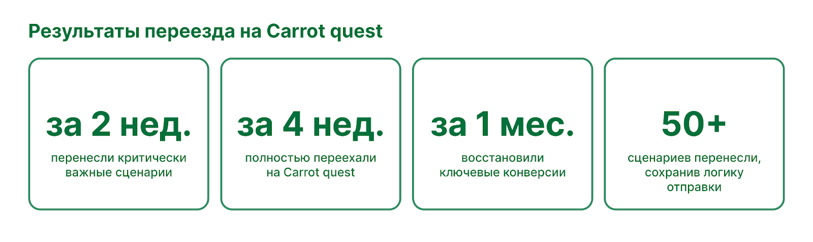 Команда Carrot quest перенесла все сценарии за 4 недели. Ключевые конверсии вернулись к показателям, которые были до переезда.