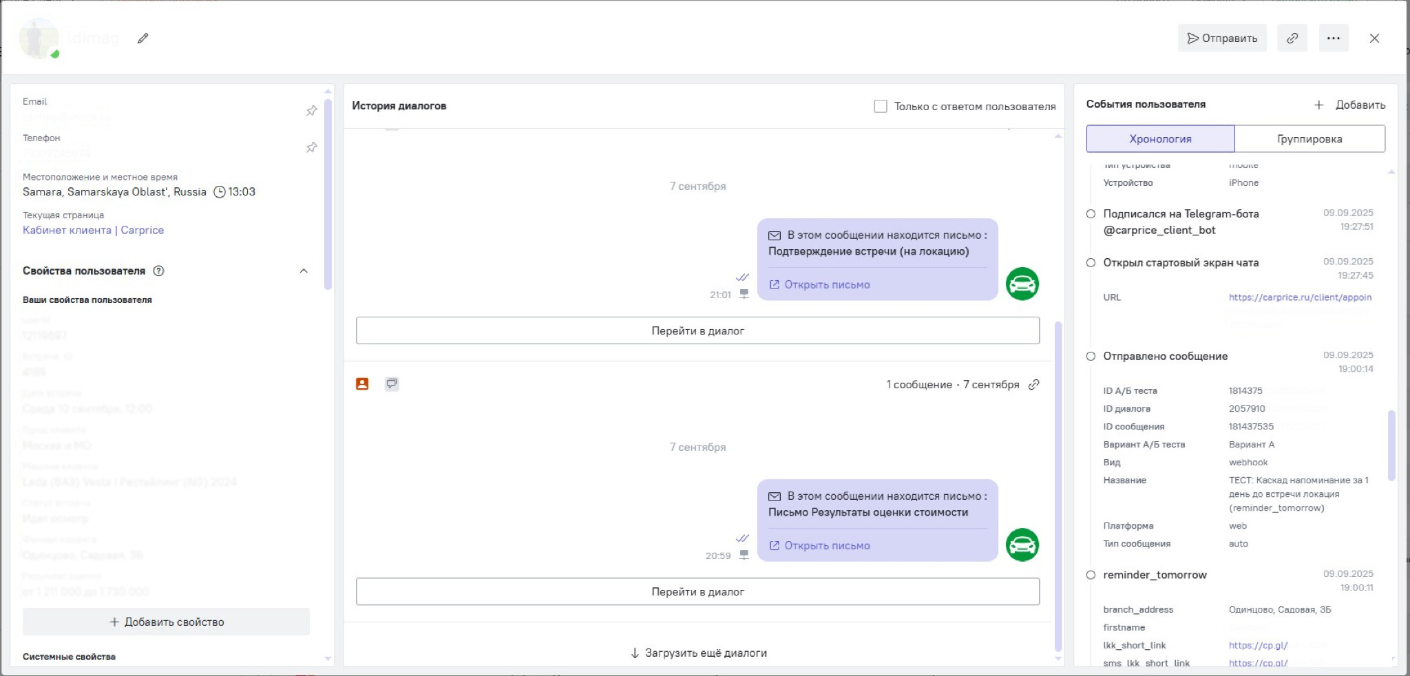 В CarPrice два аккаунта внутри Carrot quest: в одном настраивают коммуникации для продавцов, в другом — для дилеров. Маркетологи самостоятельно определяют список свойств и событий, которые будут собирать.