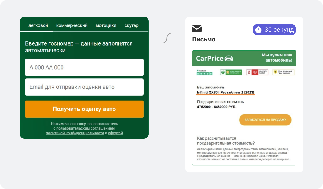 Сейчас команда CarPrice расширяет количество запущенных сценариев. Например, запустила А/В-тест с дифференцированной бонусной программой, которая мотивирует пользователей записаться на встречу.