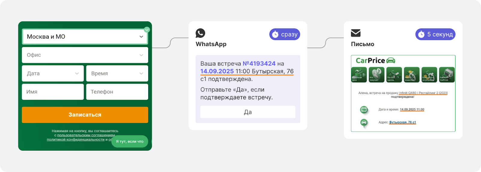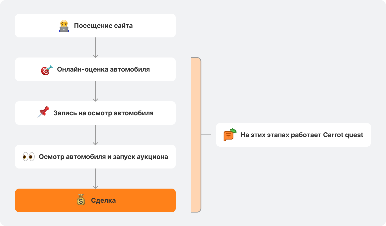 На верхнем уровне воронки CarPrice не использует дополнительные механики для сбора лидов: конверсия и так достаточно высокая — 20–25%. Главная задача начинается дальше — довести этих пользователей до сделки. Поэтому фокус на средней и нижней части воронки, именно здесь работают сценарии Carrot quest. Чтобы выстроить персональные коммуникации на этих этапах, CarPrice использует Carrot quest как центр управления всей воронкой.