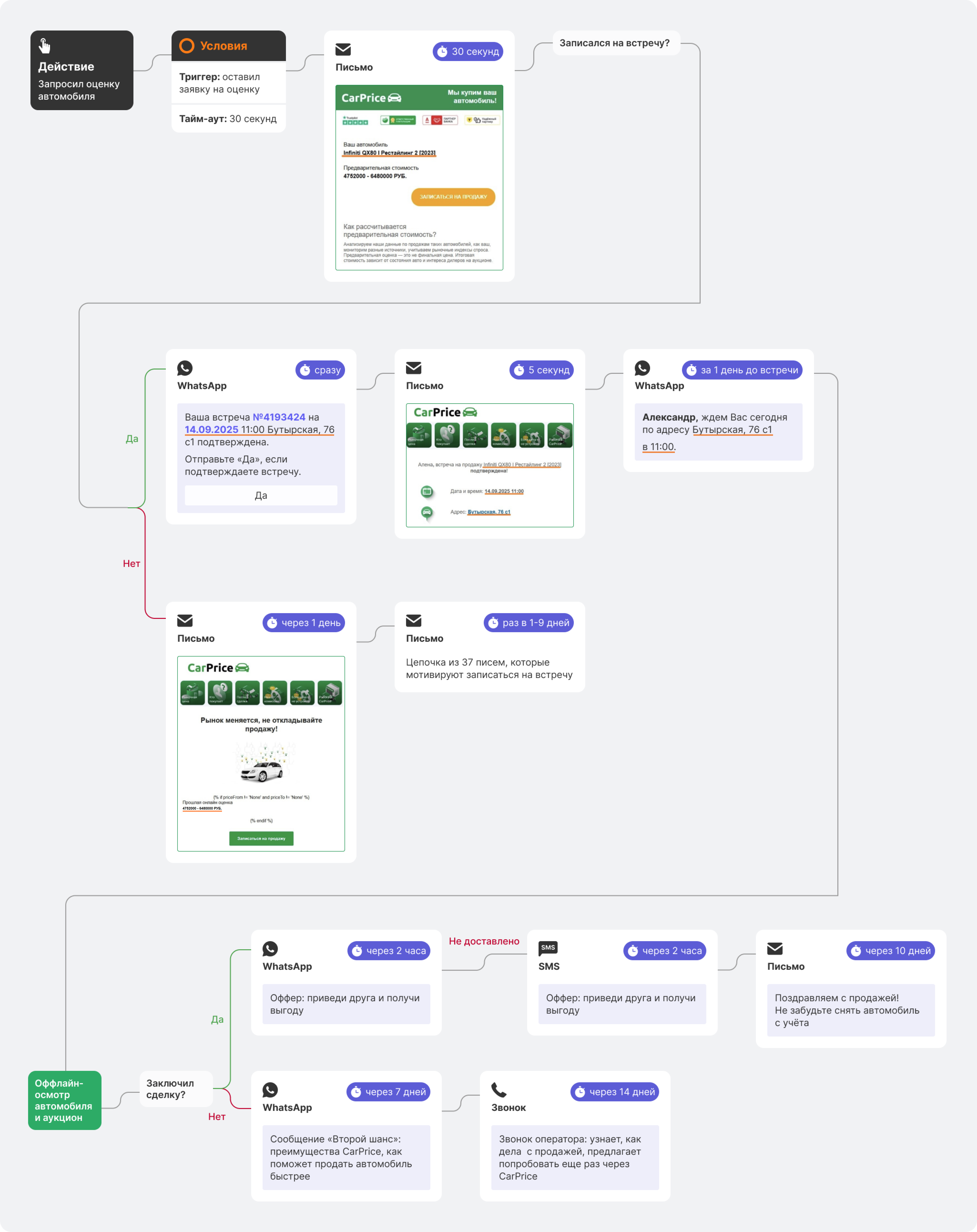 Сценарий помогает автоматически доводить продавцов от запроса оценки автомобиля до продажи. Ниже показали схему сценария, но сначала опишем логику всех шагов.