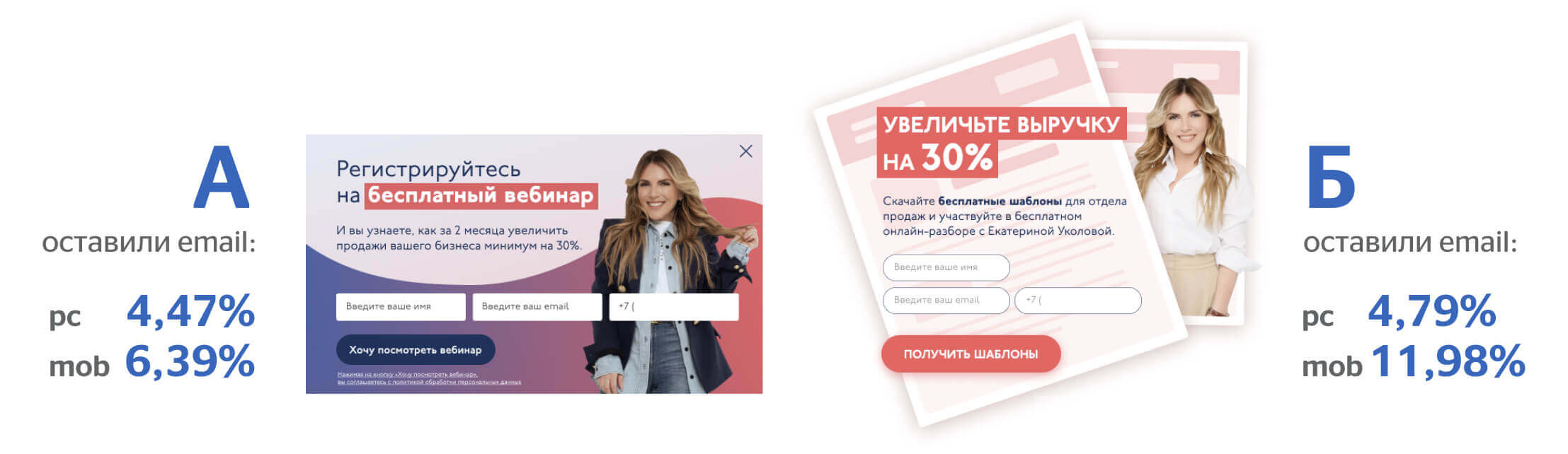 Новые контакты на сайте Oy-li собирали с помощью поп-апов с бонусами. Решили протестировать 2 оффера: в варианте А предлагали зарегистрироваться на бесплатный вебинар, а в варианте Б — увеличить выручку на 30% и скачать бесплатные шаблоны.