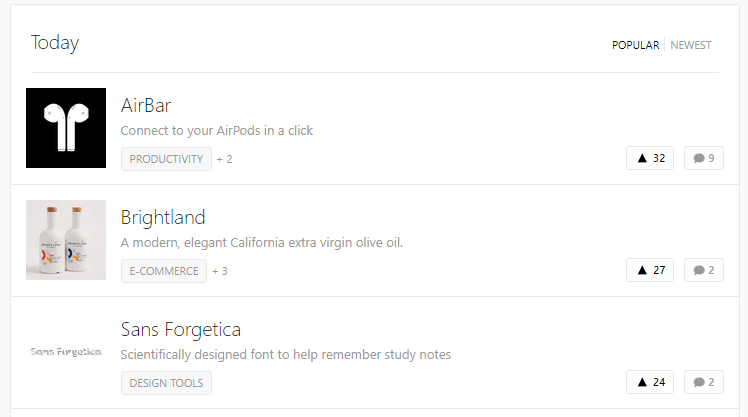 У каждого продукта на Product Hunt есть своя страница — Product Page. Каждый день самые успешные продукты из тех, что запустились, появляются на главной. Конечно же, у главной страницы самая большая видимость, поэтому нужно постараться попасть именно туда.