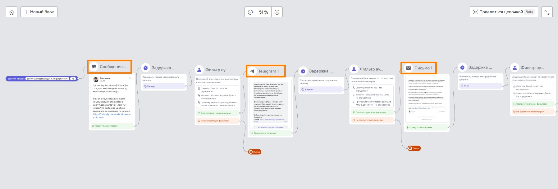 В Carrot quest сценарии можно настраивать в конструкторе «Цепочки сообщений». Это простой инструмент для сложных коммуникаций: в нем наглядно видны все блоки, условия и взаимосвязи.