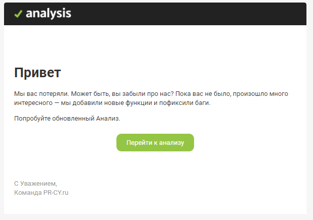 6. Реанимационные письма. Подобным письмом может завершаться цепочка писем. Например, клиент долгое время не переходил по ссылкам и не покупал товары. В реанимационном письме может содержаться мягкий призыв «вернуться», иногда текст дополняется опросом (Что нам сделать, чтобы вы вернулись к нам? Как мы можем улучшить свою работу?).