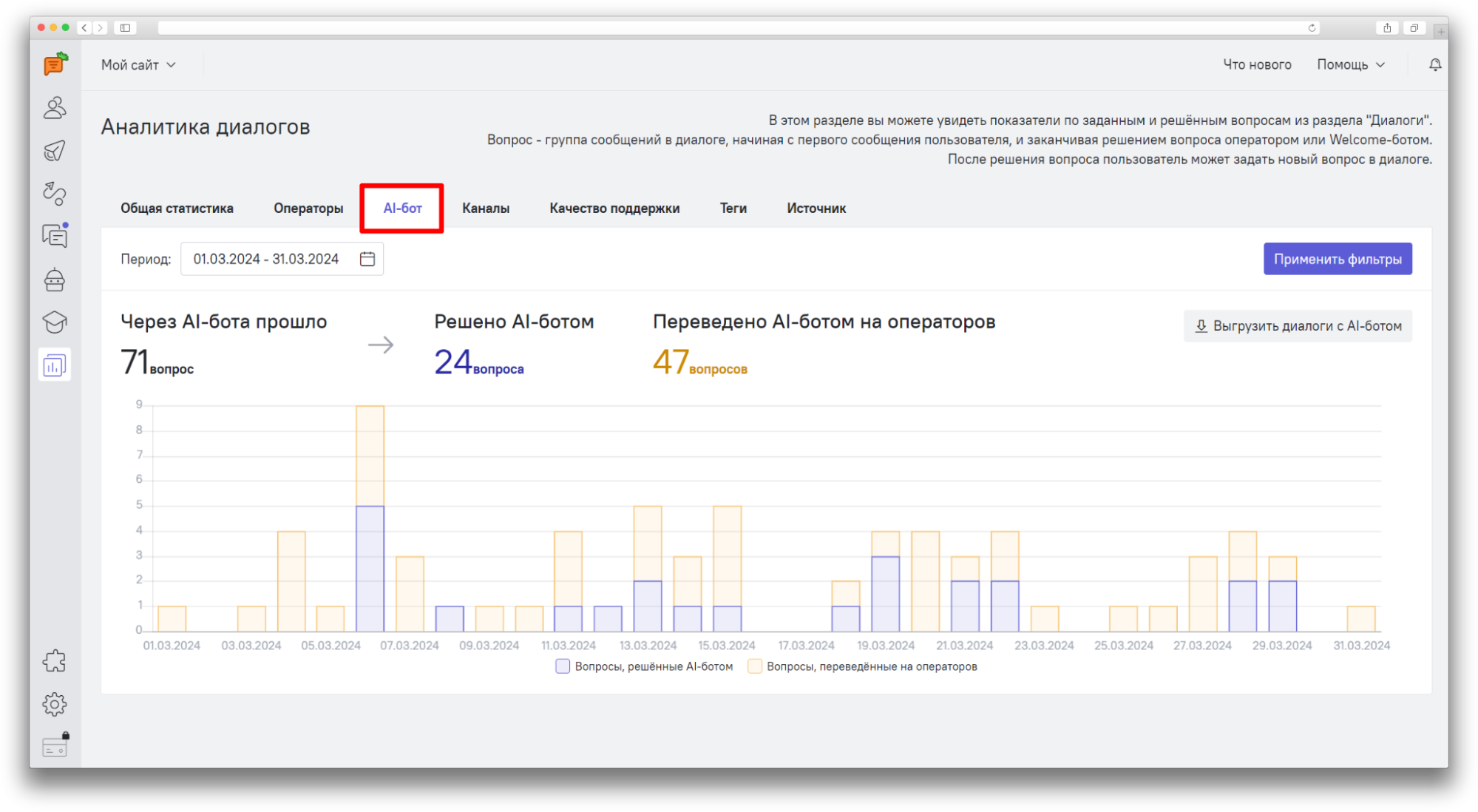 Вы также можете выгрузить из аналитики первые 500 вопросов, решенных ботом за выбранный период. Это поможет контролировать качество ответов AI-бота.