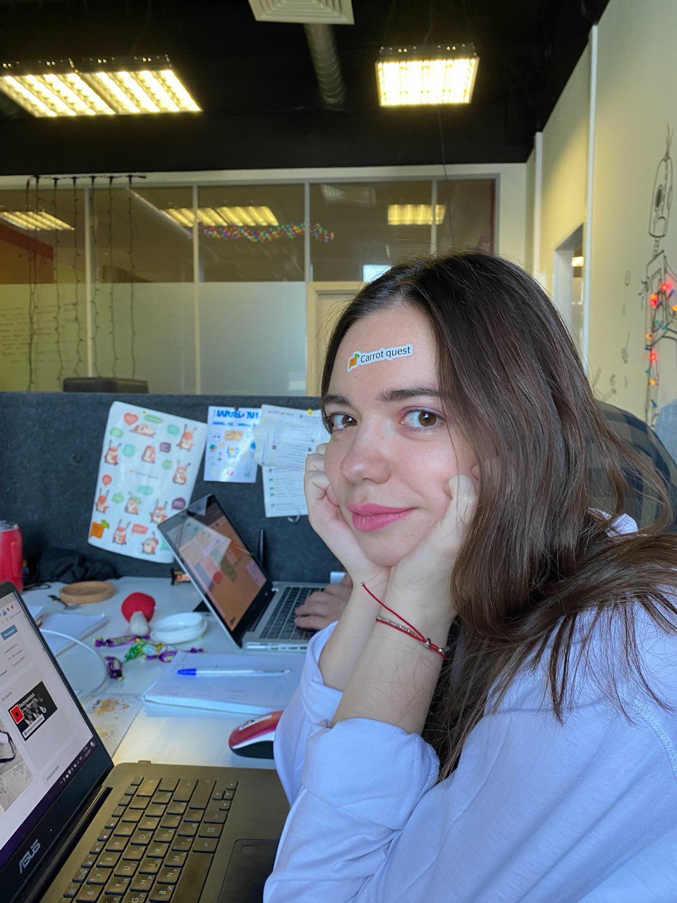 Мой путь в Carrot quest начался случайно — я училась на первом курсе магистратуры, и к нам на лекцию пришла Аня Гельфанд, тогда руководитель маркетинга. После лекции она сказала, что у них открыта вакансия маркетолога. Мне очень понравилась сама Аня и то, как она рассказывала про компанию — настолько, что я решила сходить на собеседование.