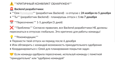 Еще одно улучшение мы придумали на хакатоне, который проводили внутри компании. У нас была сложность — пересечения отпусков. Например, если два разработчика одновременно уйдут в отпуск, это будет критично для всей команды. Поэтому мы разработали отпуск-бота, который по запросу быстро выдает ответ по пересечениям.