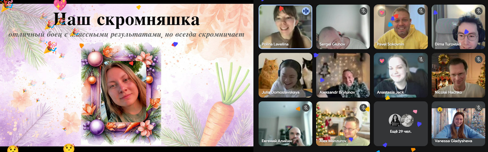 И, конечно, новогодние квесты от people-team — отдельная магия. Каждый декабрь у нас проходят онлайн-квесты, в которых мы на скорость разгадываем загадки, выполняем задания и получаем баллы — их потом обмениваем на подарки. Каждый раз поражаюсь, насколько детально все продумано.