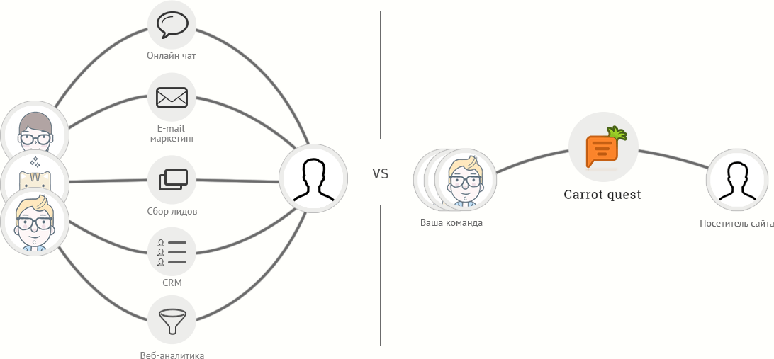 Мы с вами не из их числа — мы поступим иначе. Важно «захватить» пользователя и не дать ему возможности подумать о конкурентах. Наша задача поймать его внимание, вовлечь во взаимодействие и постепенно довести до продажи. По сути, именно на этот процесс направлены все инструменты в сервисе Carrot Quest.