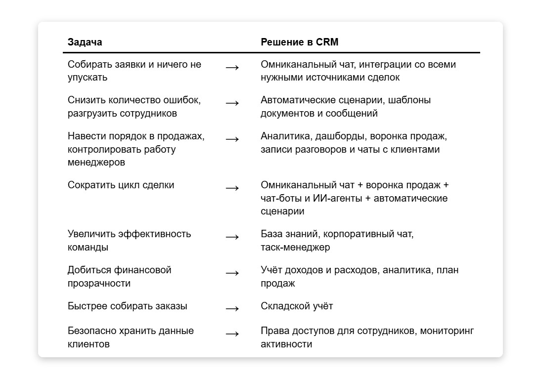 Ниже собрали задачи компаний и инструменты в CRM, которые нужны для их решения. При выборе CRM-системы сопоставляйте, есть ли у решения нужные вам функции. Это поможет понять, какая CRM-система лучше для вашей компании.