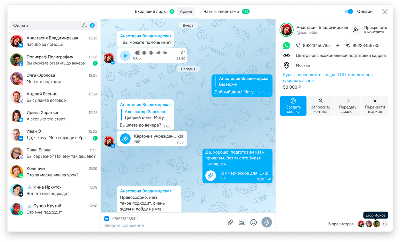 Ещё в системе есть виджет чата, который позволяет получать сообщения с сайта прямо внутри CRM-системы.