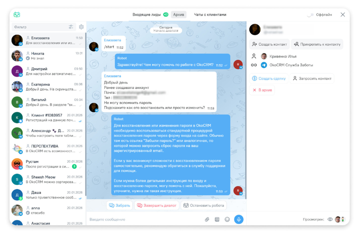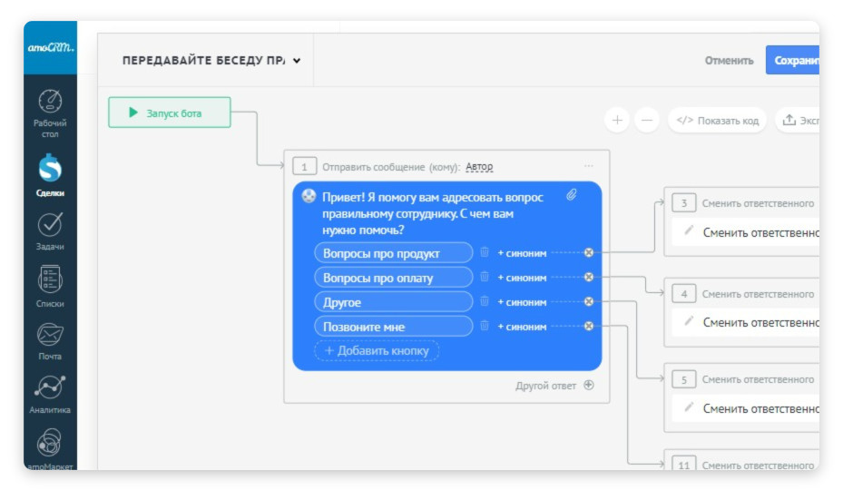 Конструктор чат‑ботов. В Oko CRM c помощью блоков в специальном конструкторе можно создавать роботов и чат-ботов, которые будут сохранять контакты, отвечать на вопросы, создавать сделки. Логику робота настраивают в визуальном конструкторе. Писать код не нужно.