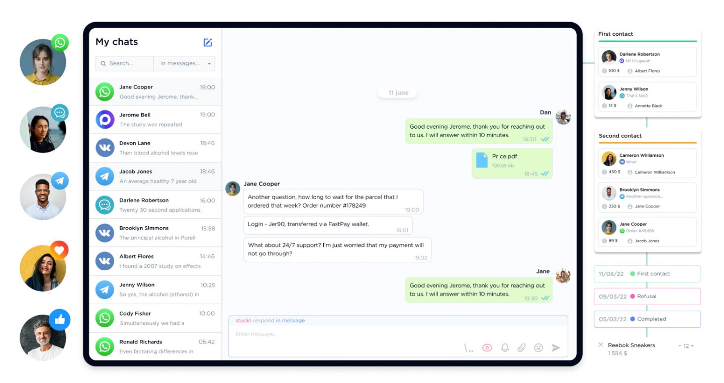 Омниканальный чат. OkoCRM объединяет все каналы общения с клиентами в одном окне. Вы можете в режиме одного окна отвечать на сообщения из мессенджеров, соцсетей, рекламных площадок и чата на сайте.