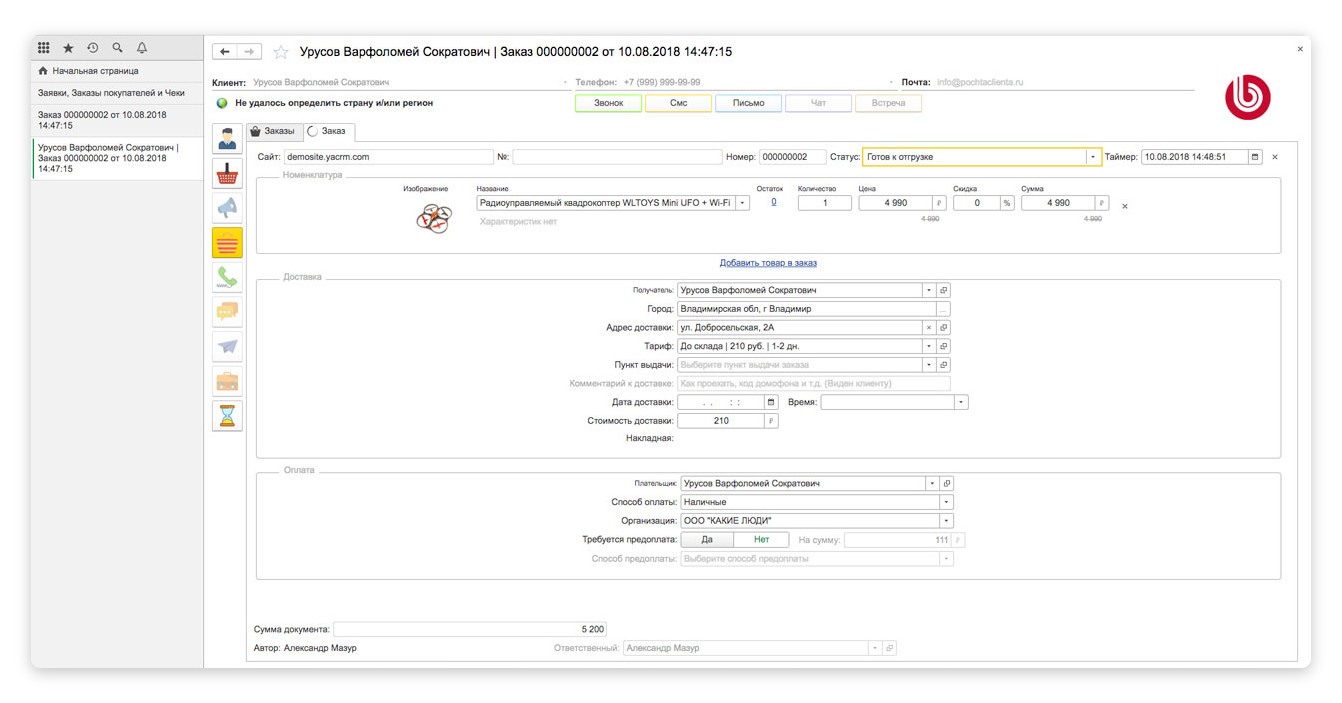 Заказ. Это потенциальные сделки, входящие заявки с сайт или соцсетей, которые автоматически попадают в Я.CRM. В разных разделах заказа лежат данные о клиенте, статусе сделки, способах оплаты.