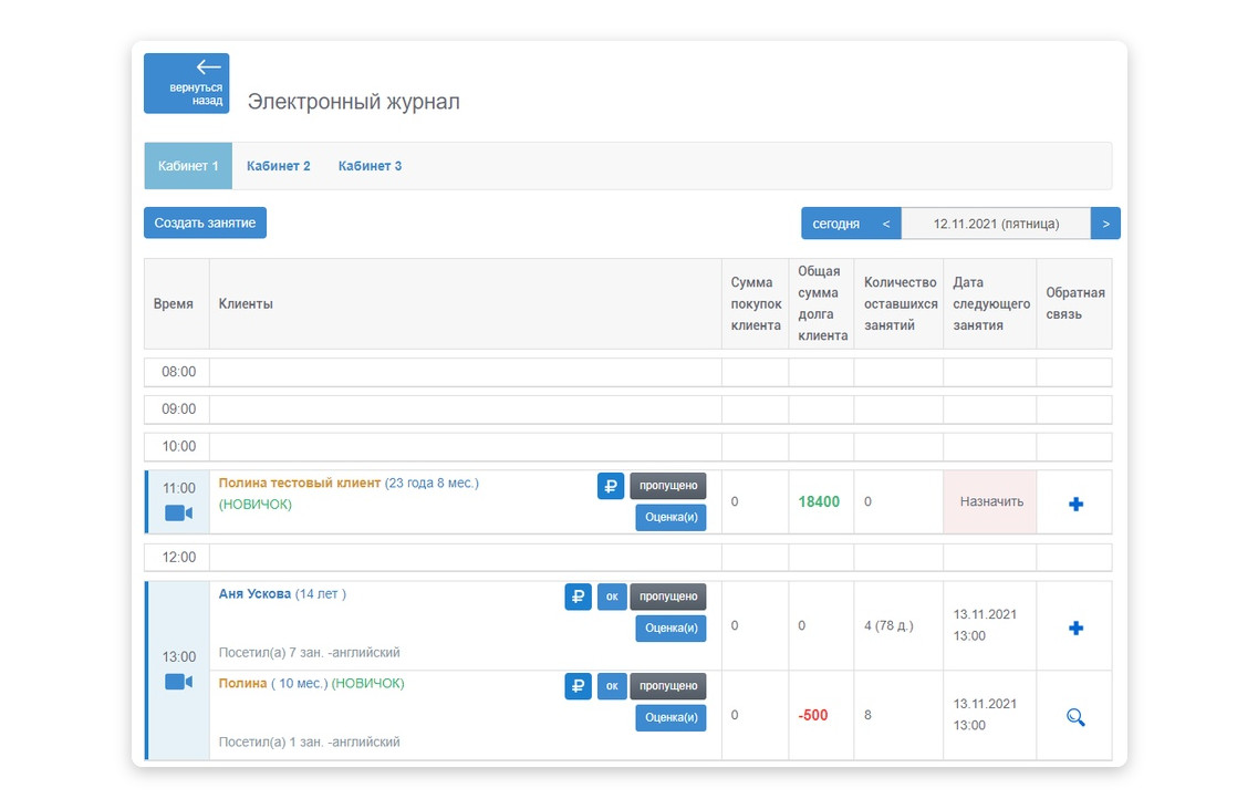 Электронный журнал. Это отчёт о посещаемости клиентов и занятиях. Здесь можно узнать, сколько занятий посетил или пропусти ученик, какие у него оценки, какие комментарии оставляет преподаватель по ученику.