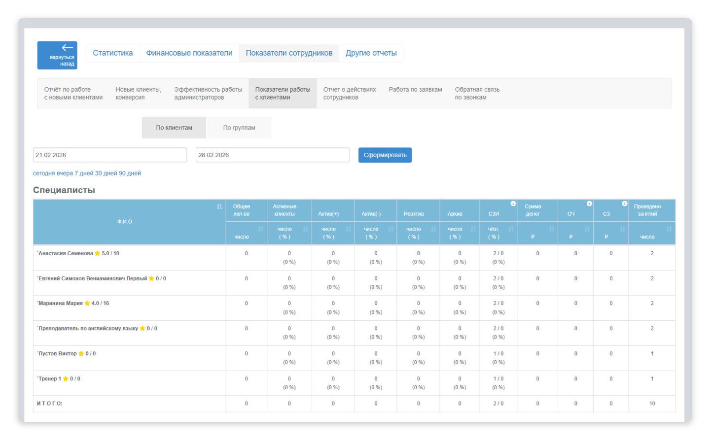 Отчёты по качеству работы сотрудников. Go CRM помогает оценить эффективность команды. Система показывает количество проведённых занятий, конверсии и финансовые показатели.