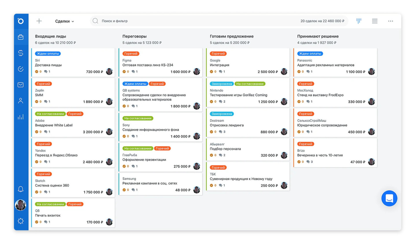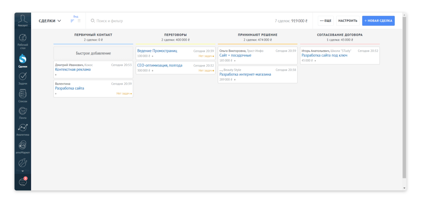 amoCRM — CRM‑система, созданная для отделов продаж компаний из разных сфер. В amoCRM есть digital‑воронка — она наглядно показывает путь клиента от первого контакта до покупки. Вы видите, на каком этапе находится каждая сделка, сколько заявок переходит с одной колонки в другую и где чаще всего теряются клиенты.