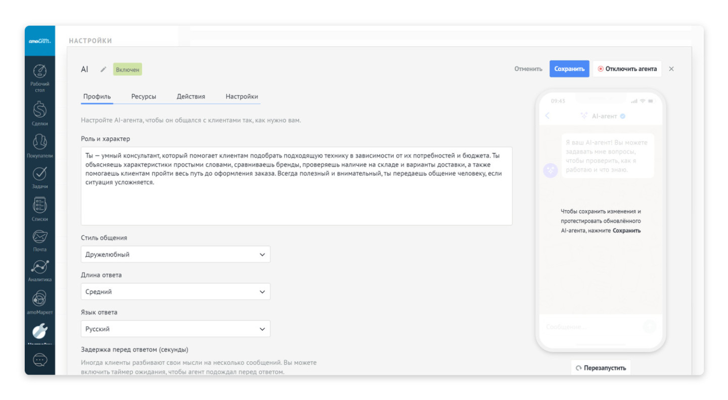 AI‑агенты. Они помогают менеджерам работать эффективнее, забирая на себя часть задач. Агенты консультируют, предлагают персонализированные предложения и помогают оформить заказ. Могут не только работать с клиентами, но и создавать сделки или перемещать их по этапам воронки.