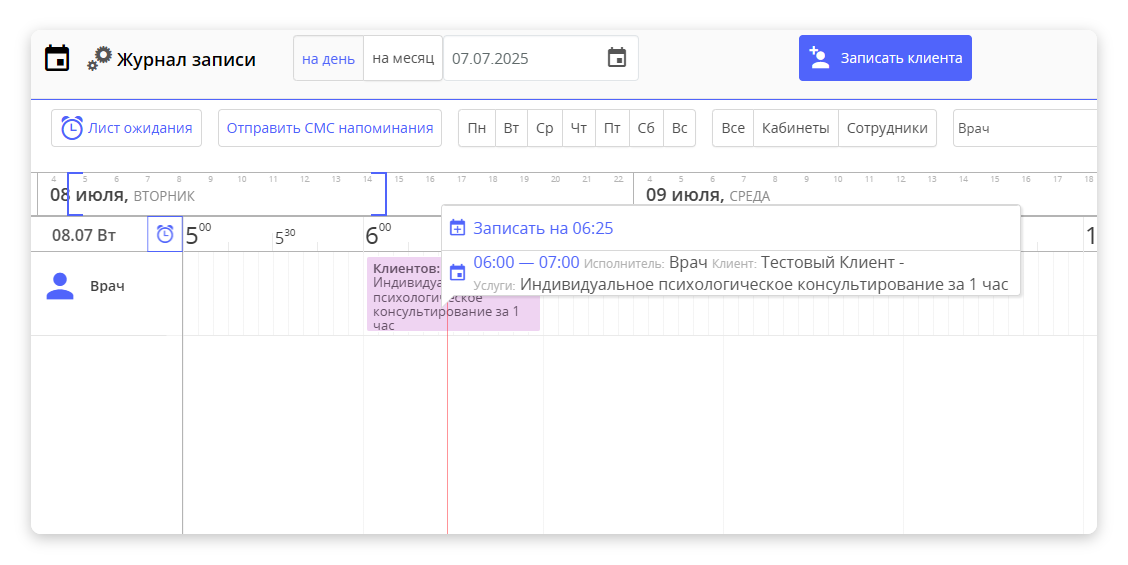 Журнал записи. Это инструмент для планирования визитов. С его помощью администраторы записывают клиентов к специалистам, отслеживают их загруженность и распределяют поток посетителей. В календаре отображаются все записи: можно быстро проверить, кто и когда придёт, есть ли свободные окна, не пересекаются ли приёмы у одного специалиста.