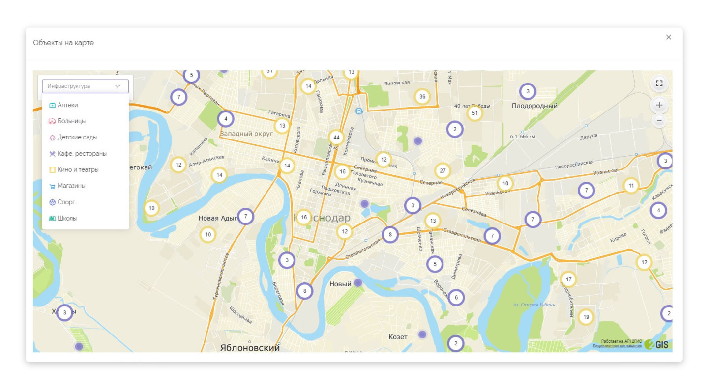 Карта объектов. Это визуализация карты с объектами на ней, инструмент для быстрого поиска нужной недвижимости. Все добавленные объекты отображаются на интерактивной карте. Вы можете быстро оценить распределение предложений по районам или найти свободные участки или дома рядом с определённой инфраструктурой.