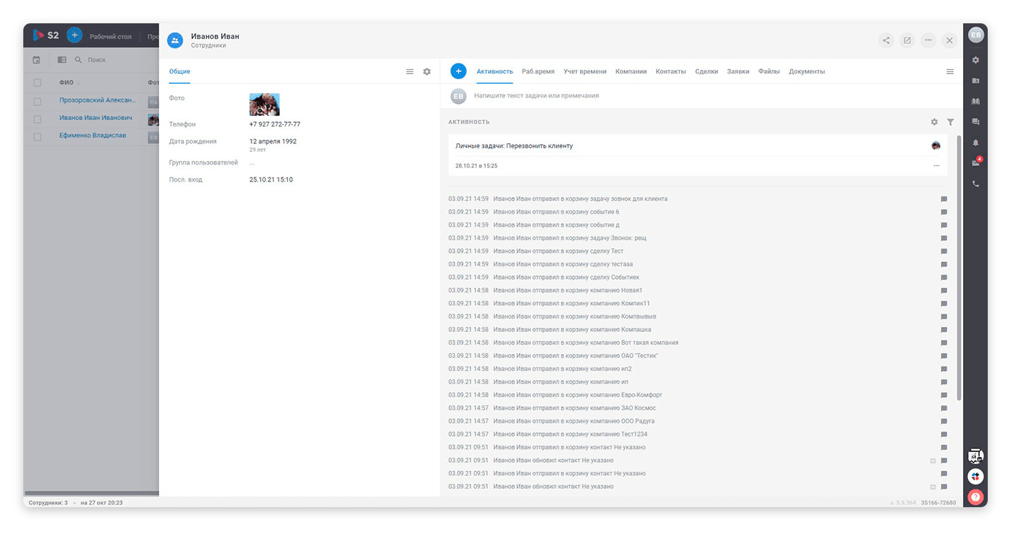 Учёт работы сотрудников. Здесь можно настроить сотрудникам право вести учёт рабочего времени, включая и отключая таймер рабочей сессии. Руководитель может вести табель рабочего времени. На каждого сотрудника в системе заводят карточку, в которой хранится информация о его действиях, сделках, активности.