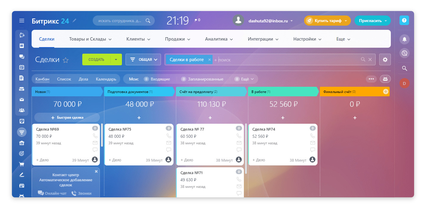 Клиентская база. Все данные о клиентах хранятся в единой базе — это раздел с карточками контактов. В карточках собраны контактные данные, история покупок и сделок, предпочтения клиентов и вообще любая информация, которую вы захотите сохранить.