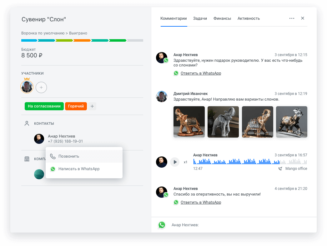 Клиентская база. В ней собраны контактные данные, история сделок, записи разговоров, переписки и заметки менеджеров. Благодаря этому любой сотрудник быстро узнаёт всё самое важное о клиенте.