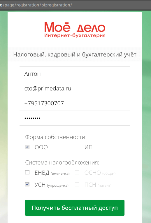 Во время процесса регистрации на этом сервисе появляется стандартная форма: пользователю необходимо оставить имя, свой телефон, электронную почту, отметить предпочитаемую форму собственности (ООО или ИП) и систему налогообложения (ЕНВД или УСН).