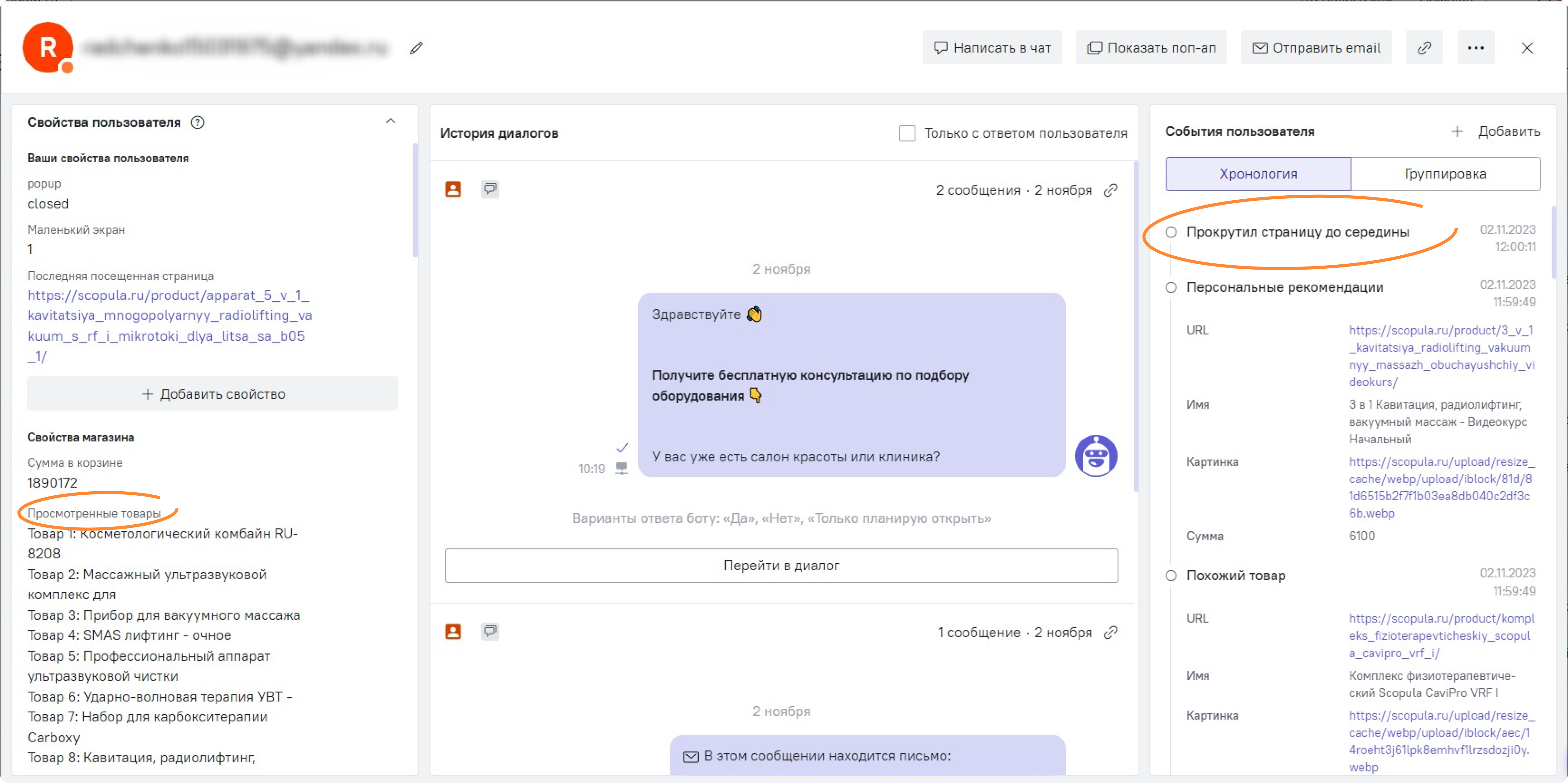 Так выглядит карточка пользователя в Carrot quest, где можно посмотреть все, что он делал на сайте Scopula: