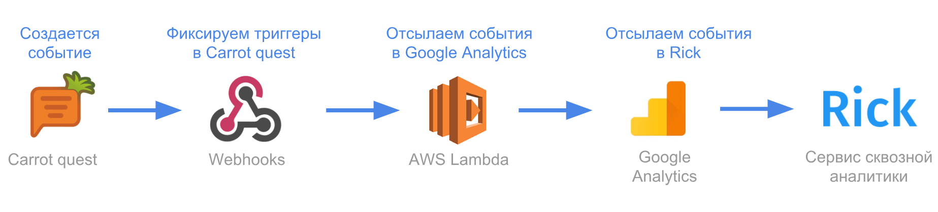 Передача данных работает следующим образом. Событие возникает в Carrot quest и по Webhooks передаётся в AWS Lambda. Lambda же отправляет события через datalayer в Google Analytics, а оттуда они поступают в Rick.