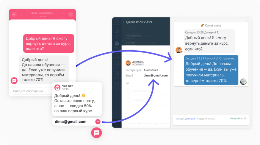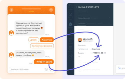 Автоматически передавайте данные о лидах и диалоги с пользователями из чата в amoCRM. Например, ответы на квалифицирующие вопросы в поп‑апах и лид‑ботах, контактные данные и другие.