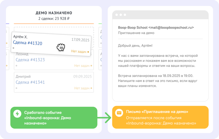 Автоматизируйте коммуникацию с пользователями на основе движения сделок по воронке в amoCRM. Например, можно автоматически уведомлять пользователей о назначенной встрече или смене статуса заявки: «Заказ передан в отдел сборки».