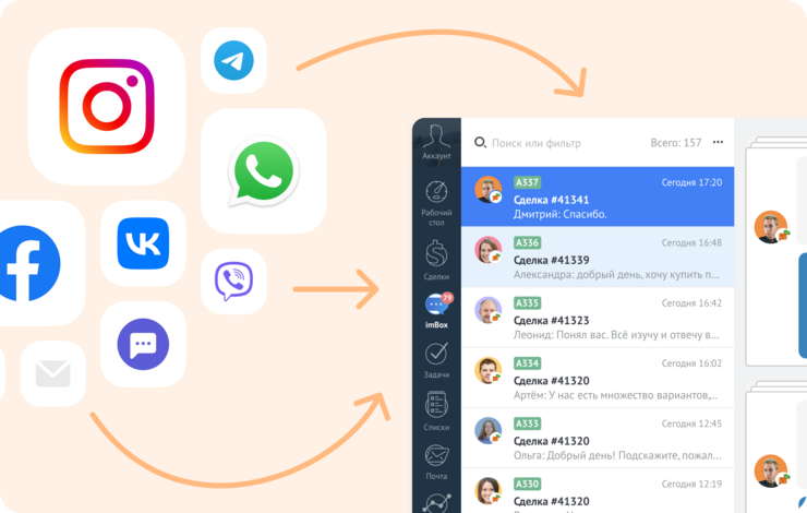 Автоматически собирайте данные о пользователях из всех каналов коммуникации — от чатов и форм заявок до триггерных сообщений и соцсетей — и передавайте их в amoCRM. Отвечайте клиентам прямо из CRM без переключений и потери контекста.