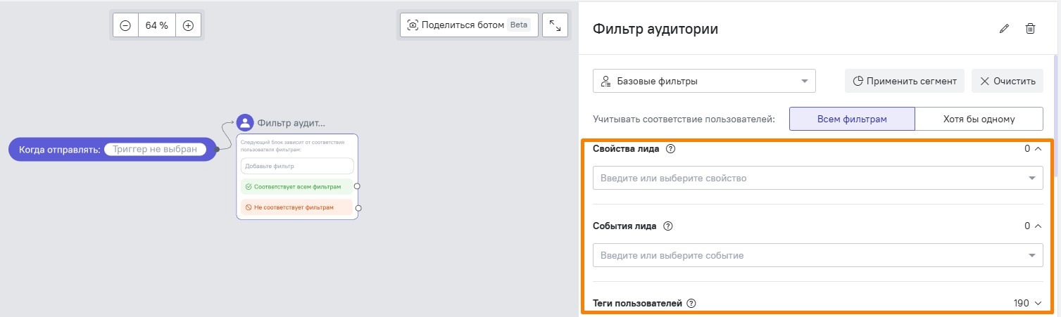 Добавление блока «Фильтр аудитории» в конструкторе Telegram-ботовНастройка фильтра аудитории: можно выбрать свойства лида, события лида или теги пользователя, которые сохранены в Carrot quest
