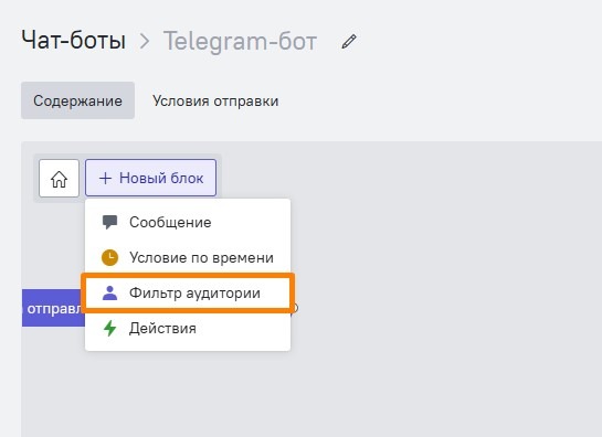 Добавить блок «Фильтр аудитории» в конструкторе Telegram-бота.