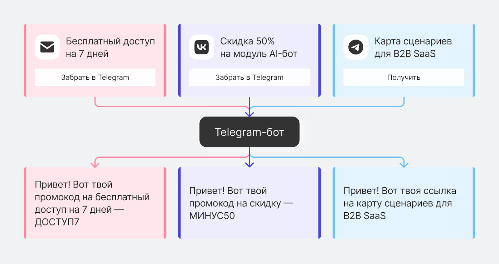 Сценарий первый. Вы ведете в Telegram-бота из разных источников, но офферы во всех источниках разные: