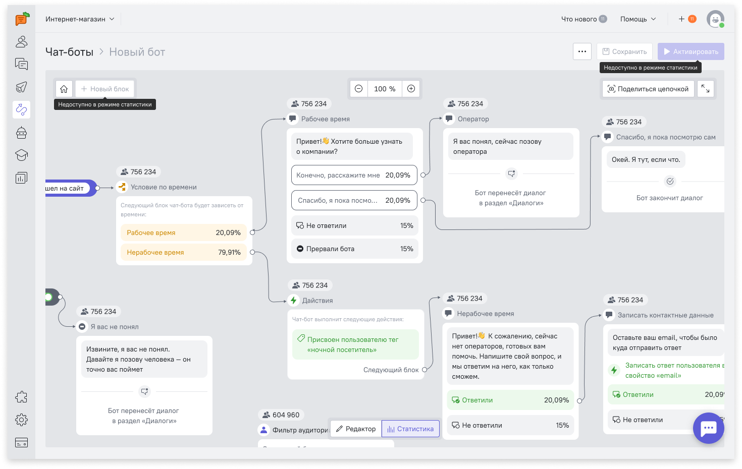 Теперь в конструкторе чат-ботов прямо на канвасе отображается инкрементальная статистика переходов по веткам. Обновление доступно в Telegram-боте, Welcome-ботах и лид-ботах на сайте.