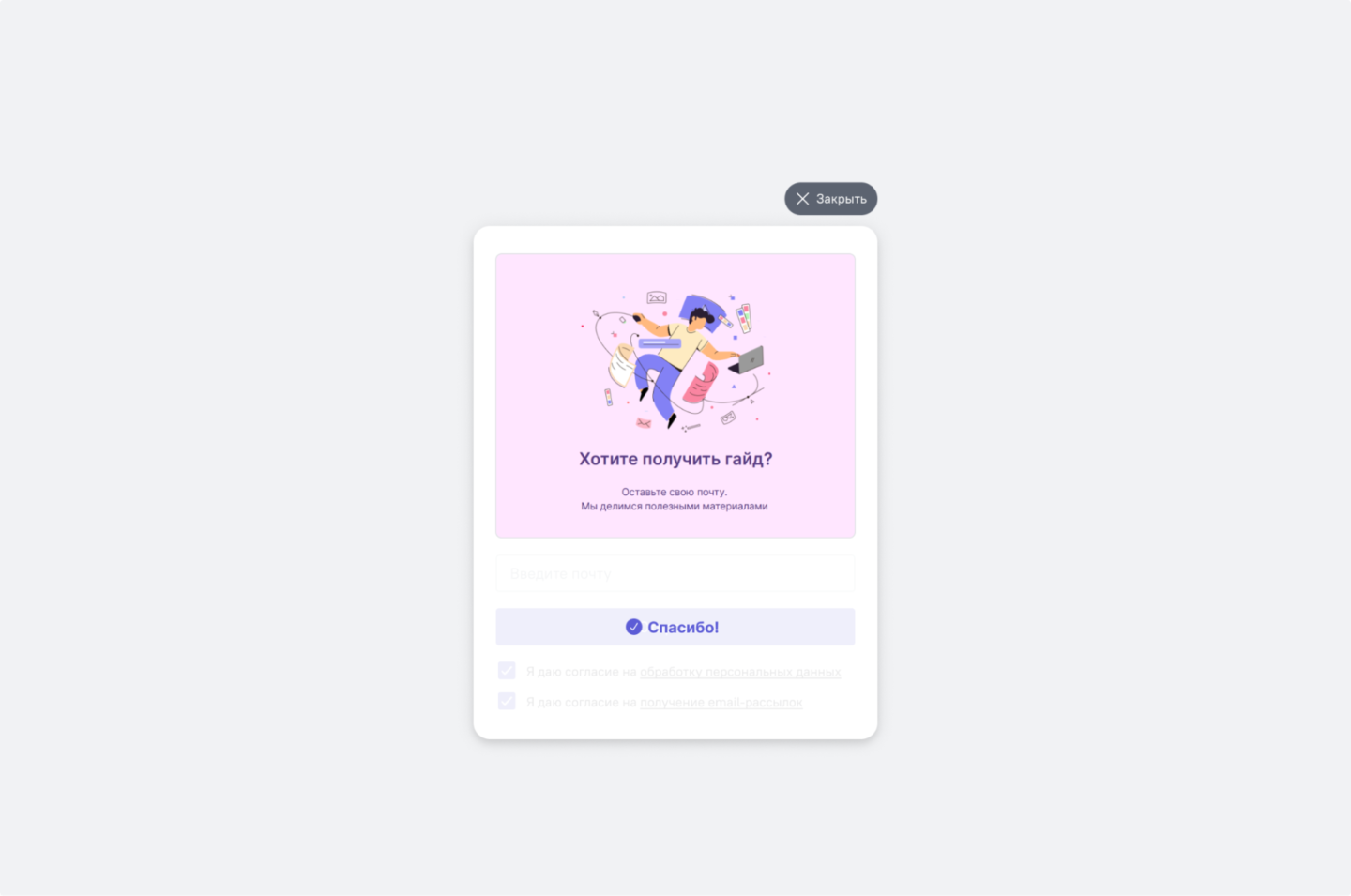 После того как пользователь отправляет данные через форму в поп-апе, ему отображается сообщение «Спасибо». Это подтверждает успешную передачу информации и обеспечивает четкую обратную связь.