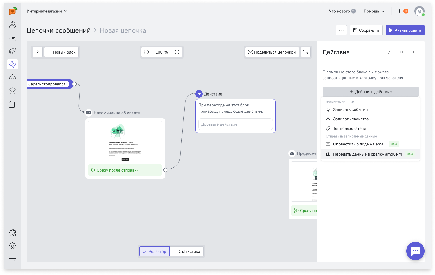Полноценное использование цепочек. Теперь можно строить многошаговые персонализированные сценарии и при этом передавать все данные в AmoCRM.